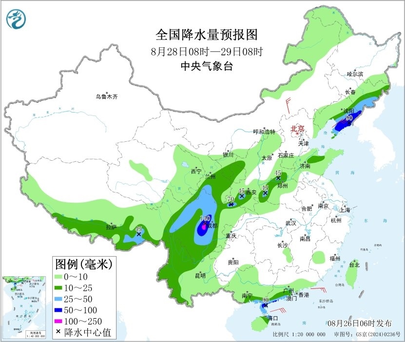 8月28日08時至29日08時,吉林東部、遼寧中東部、甘肅南部、寧夏、陜西、山東北部、河南北部和西部、四川盆地西部、川西高原、云南西部、西藏南部、廣東西南部、廣西南部、海南島等地的部分地區(qū)有中到大雨,其中,遼寧東部和南部、陜西南部、四川盆地西部、廣東西南部等地的部分地區(qū)有暴雨,局地大暴雨(100~140毫米)。內(nèi)蒙古中東部、遼東半島、山東半島等地的部分地區(qū)有4~6級風。渤海有6~7級、陣風8級的東北風,黃海北部海域有5~7級、陣風8級的偏南風,南海東北部海域有5~7級、陣風8級的偏東風。