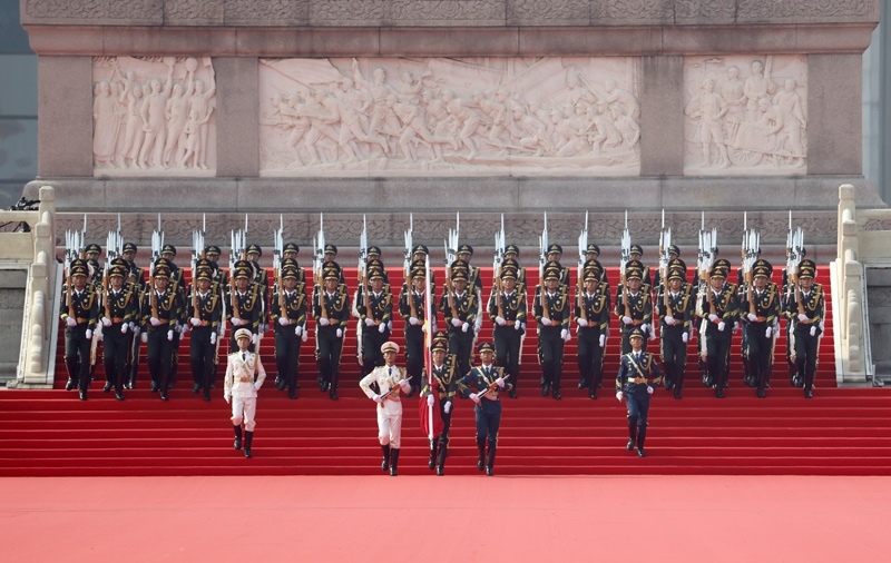 9月3日,紀(jì)念中國(guó)人民抗日戰(zhàn)爭(zhēng)暨世界反法西斯戰(zhàn)爭(zhēng)勝利80周年大會(huì)在北京隆重舉行。這是國(guó)旗護(hù)衛(wèi)隊(duì)從人民英雄紀(jì)念碑基座出發(fā),走向旗桿基座。