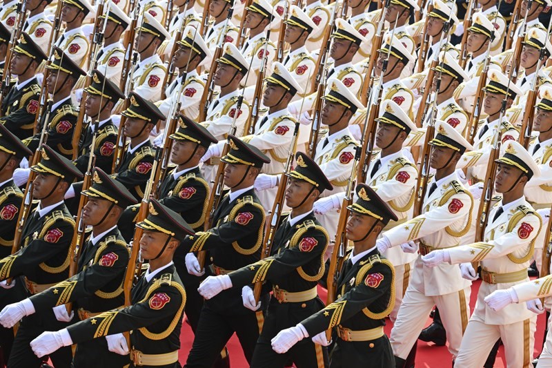 9月3日,紀(jì)念中國(guó)人民抗日戰(zhàn)爭(zhēng)暨世界反法西斯戰(zhàn)爭(zhēng)勝利80周年大會(huì)在北京隆重舉行。這是國(guó)旗護(hù)衛(wèi)隊(duì)在行進(jìn)中。