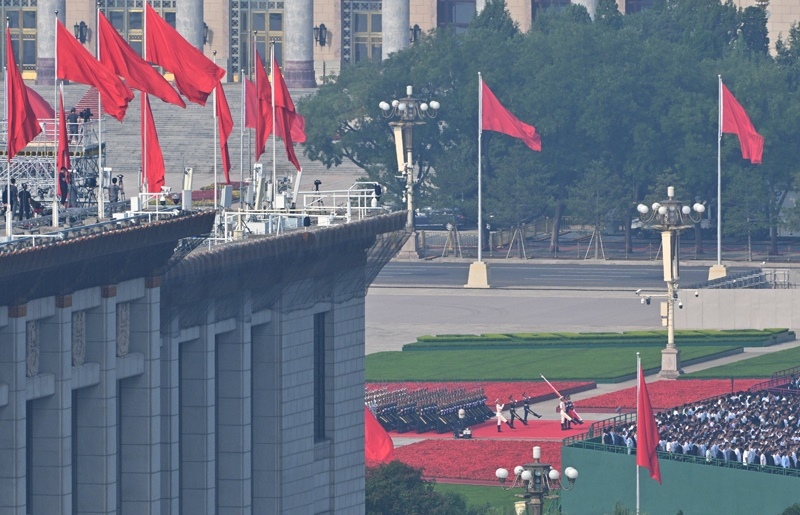 9月3日,紀(jì)念中國(guó)人民抗日戰(zhàn)爭(zhēng)暨世界反法西斯戰(zhàn)爭(zhēng)勝利80周年大會(huì)在北京隆重舉行。這是天安門廣場(chǎng)舉行隆重的升國(guó)旗儀式。