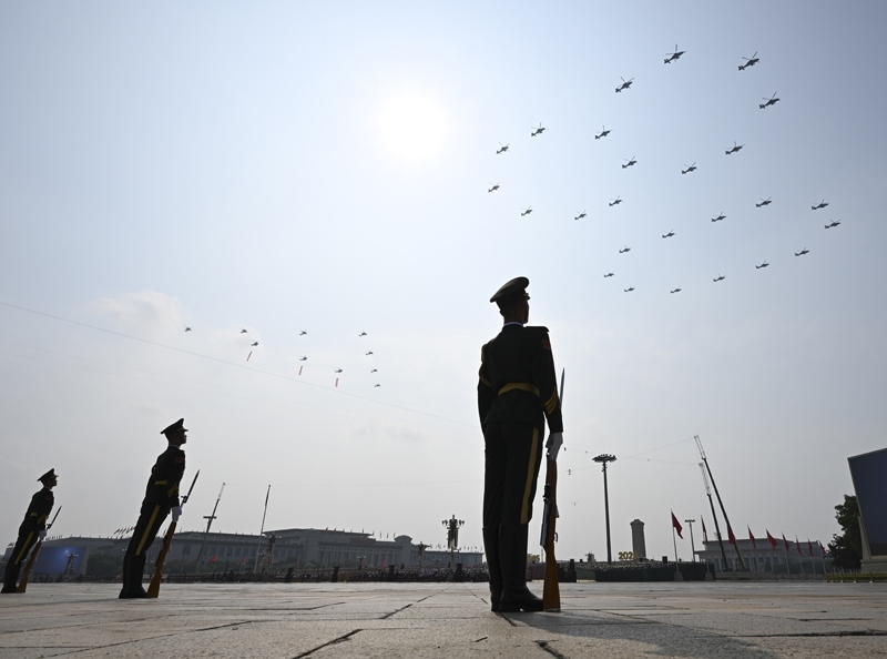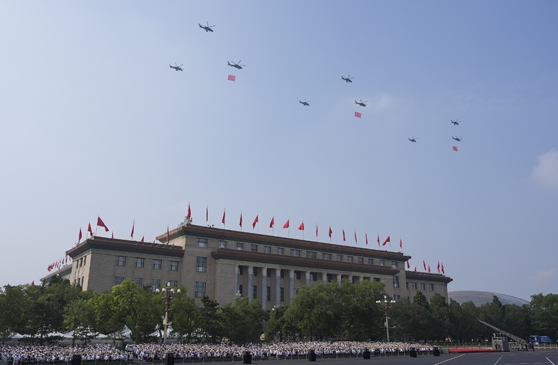 9月3日,紀念中國人民抗日戰(zhàn)爭暨世界反法西斯戰(zhàn)爭勝利80周年大會在北京隆重舉行。這是空中護旗梯隊。