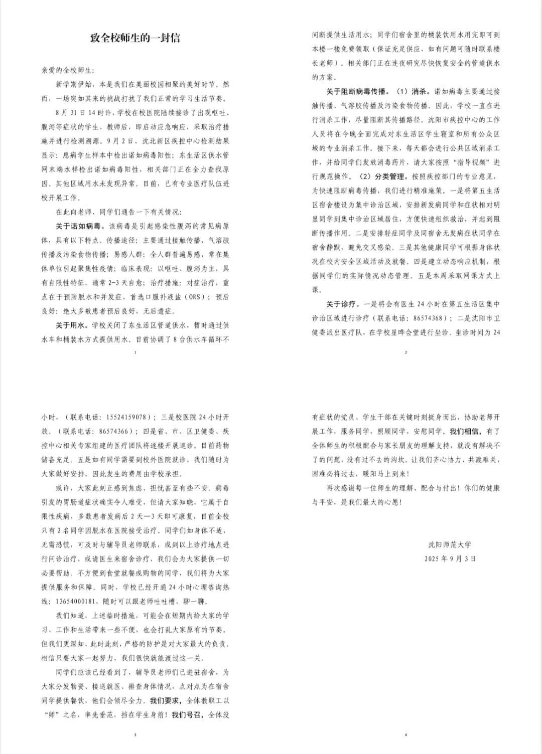9月3日,沈陽(yáng)師范大學(xué)發(fā)布的《致全校師生的一封信》(以下簡(jiǎn)稱(chēng)“《一封信》”)中稱(chēng),8月31日14時(shí)許,學(xué)校在校醫(yī)院陸續(xù)接診了出現(xiàn)嘔吐、腹瀉等癥狀的學(xué)生、教師。相關(guān)部門(mén)正在全力查找原因,目前已有專(zhuān)業(yè)醫(yī)療隊(duì)伍進(jìn)校開(kāi)展工作。