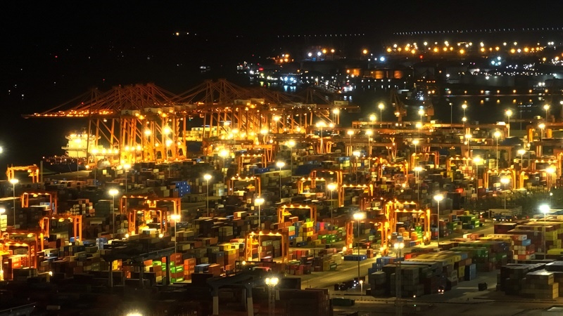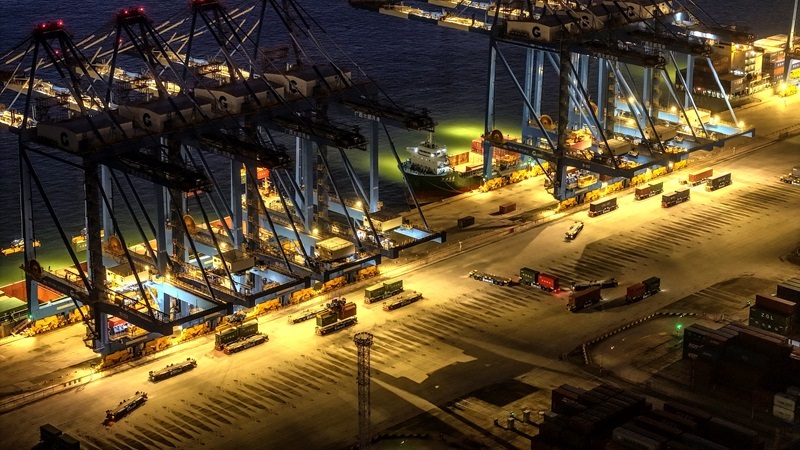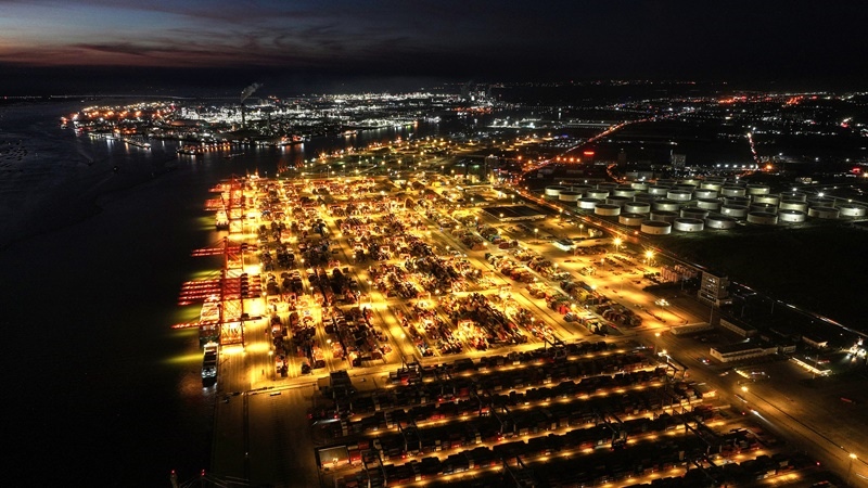 正在進(jìn)行晚間作業(yè)的欽州港碼頭(9月4日攝,無人機(jī)照片)。