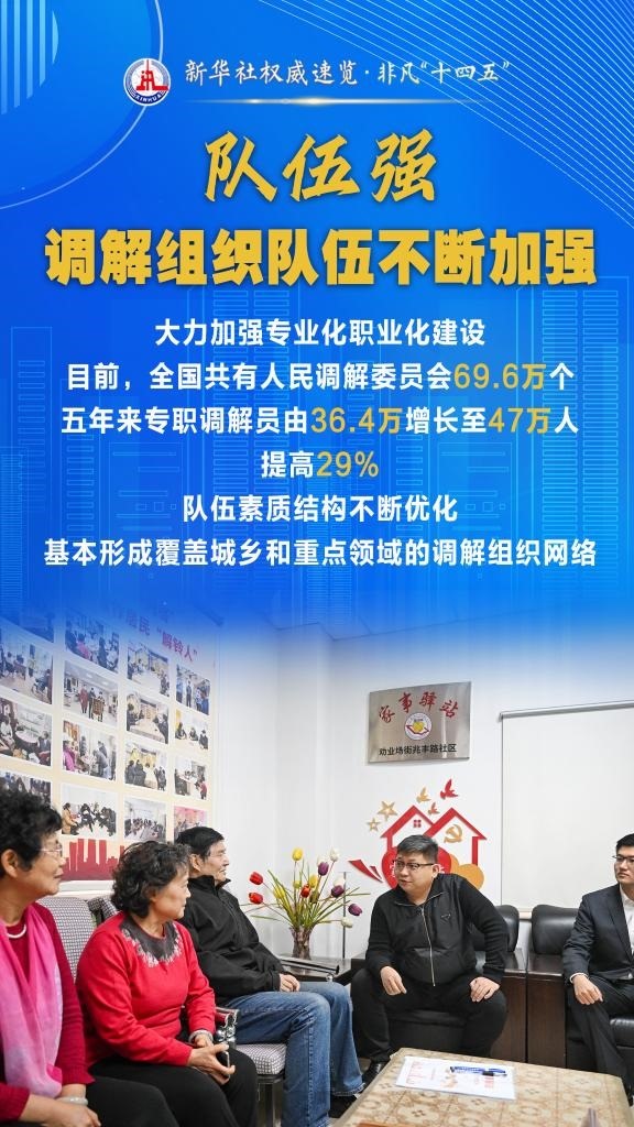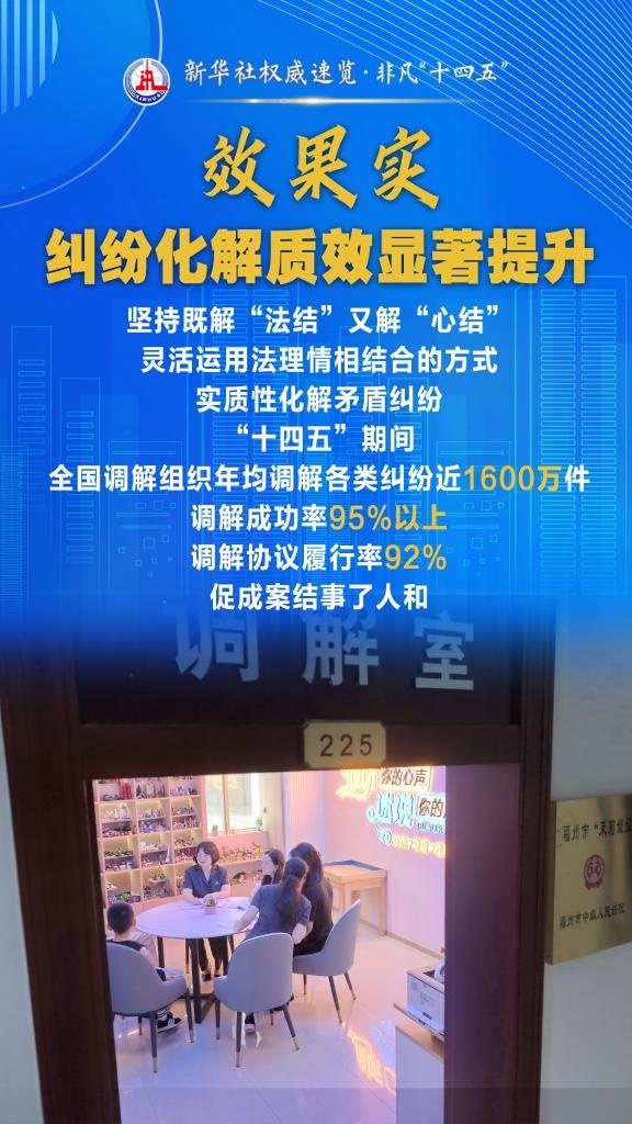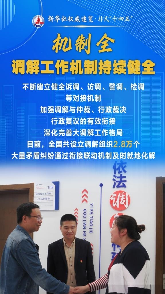 “十四五”期間,司法部堅(jiān)持和發(fā)展新時(shí)代“楓橋經(jīng)驗(yàn)”,充分發(fā)揮調(diào)解職能作用,以“機(jī)制全、領(lǐng)域廣、隊(duì)伍強(qiáng)、效果實(shí)”十二字為工作“秘訣”,大力加強(qiáng)矛盾糾紛排查化解,切實(shí)保障群眾合法權(quán)益,維護(hù)社會(huì)和諧穩(wěn)定。