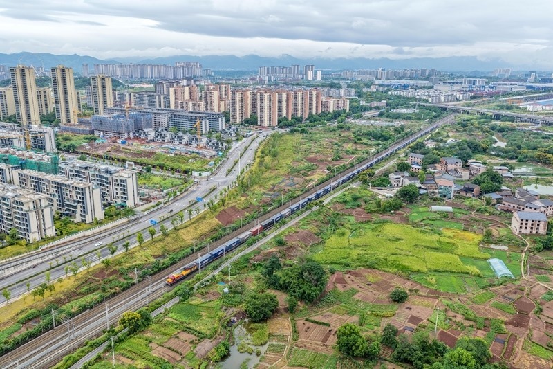 9月8日,滿載“重慶造”汽車的中歐班列(成渝)在重慶團結(jié)村中心站順利發(fā)車(無人機照片)。