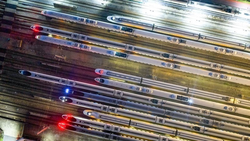 10月10日,動(dòng)車組列車駛出南京動(dòng)車段南京南動(dòng)車運(yùn)用所(無人機(jī)照片)。