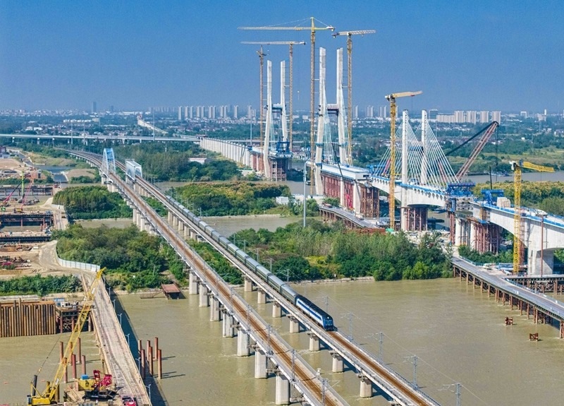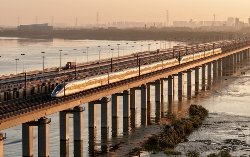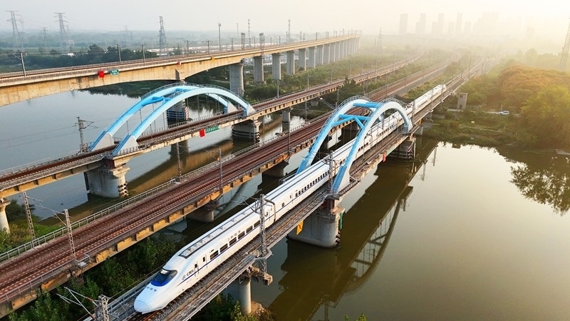 10月10日,在江蘇省昆山市,動(dòng)車組列車通過京滬高鐵丹昆特大橋陽澄湖段(無人機(jī)照片)。