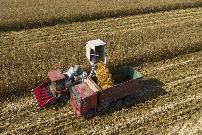 10月17日,在甘肅省武威市涼州區(qū)武南鎮(zhèn),大型機(jī)械在田間收獲玉米(無人機(jī)照片)。