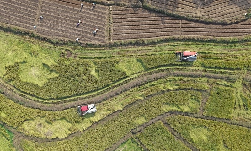 10月17日,在浙江省臺州市仙居縣雙廟鄉(xiāng),農(nóng)機(jī)手駕駛農(nóng)機(jī)收割晚稻(無人機(jī)照片)。