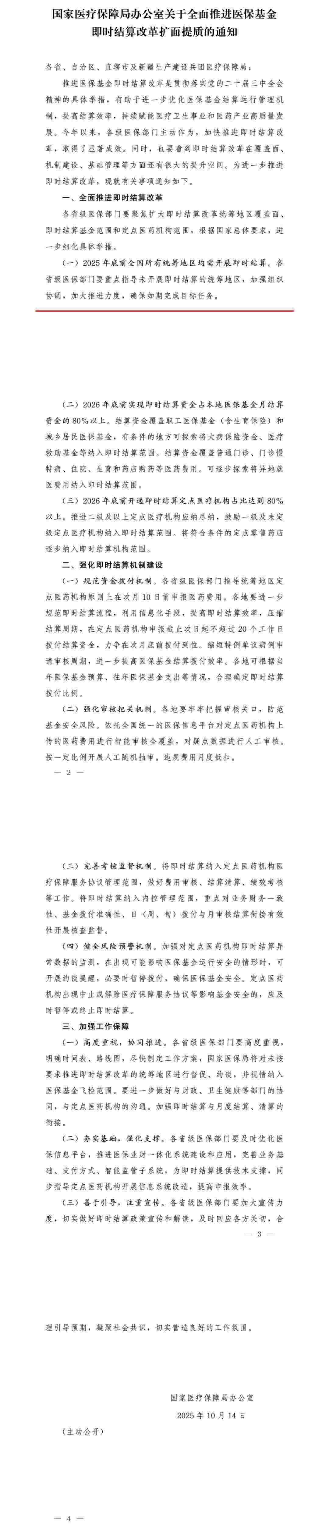 據(jù)國(guó)家醫(yī)保局官方微信消息,國(guó)家醫(yī)療保障局辦公室發(fā)布《關(guān)于全面推進(jìn)醫(yī)保基金即時(shí)結(jié)算改革擴(kuò)面提質(zhì)的通知》。全文如下: