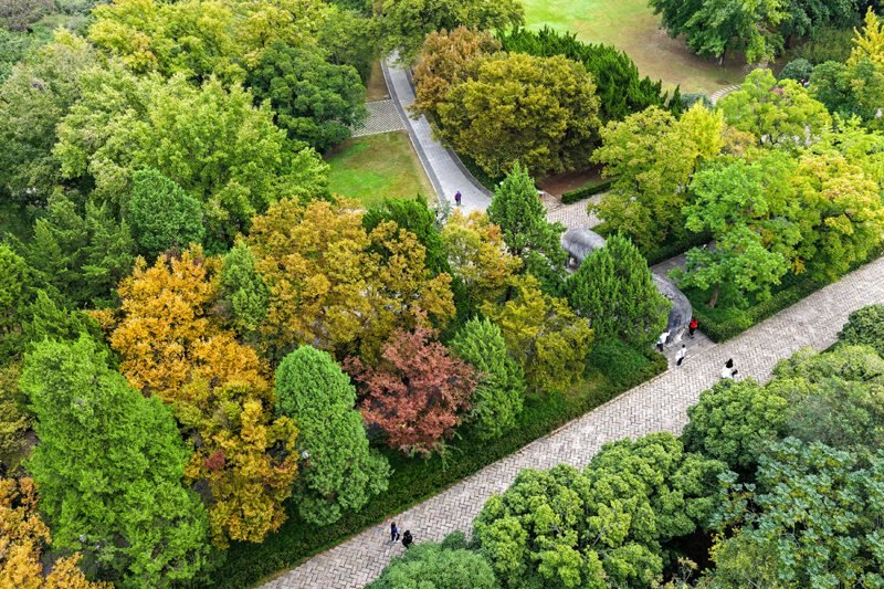 10月17日,游人在南京明孝陵景區(qū)石象路賞景游玩(無(wú)人機(jī)照片)。