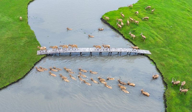 10月17日,在江蘇省泰州市姜堰區(qū)溱湖國(guó)家濕地公園,一群麋鹿通過(guò)獨(dú)木橋(無(wú)人機(jī)照片)。