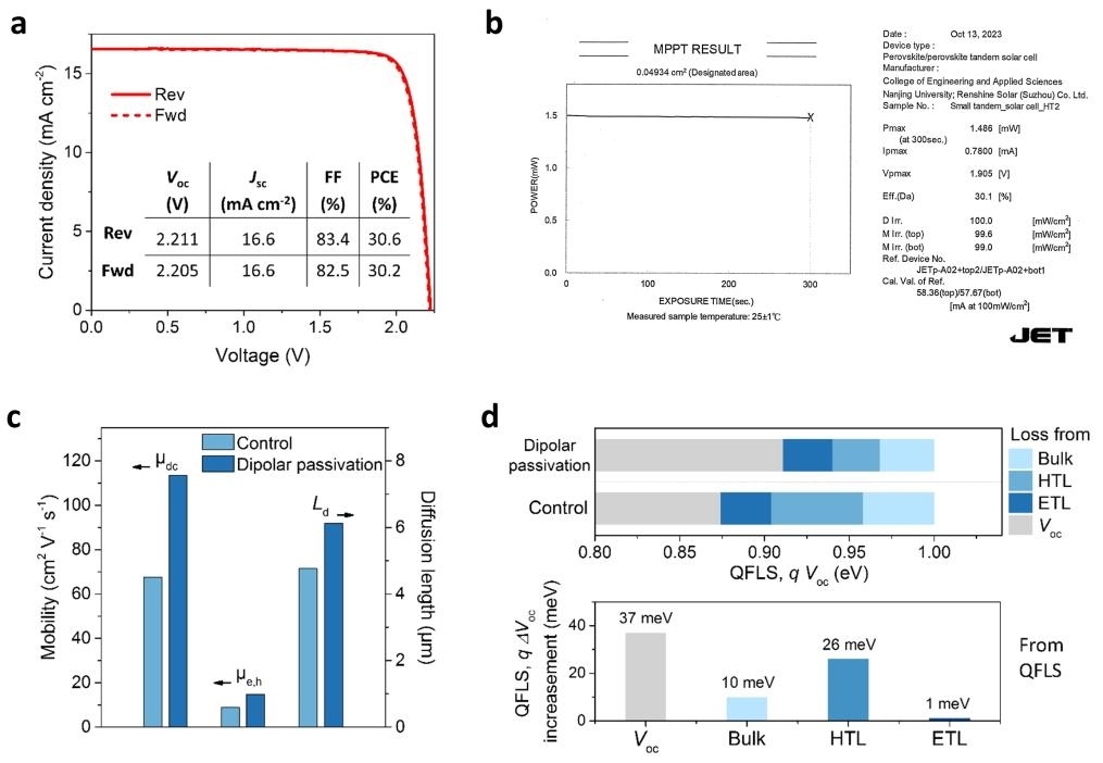 此次研究中科研人員發(fā)現(xiàn),鈣鈦礦吸光層和空穴傳輸層之間的界面,是載流子損耗較多的區(qū)域。團隊為此設計出一種偶極鈍化層,它就像城市里的單行道,一頭連著鈣鈦礦吸光層,一頭連著空穴傳輸層,驅使載流子向空穴傳輸層運動。