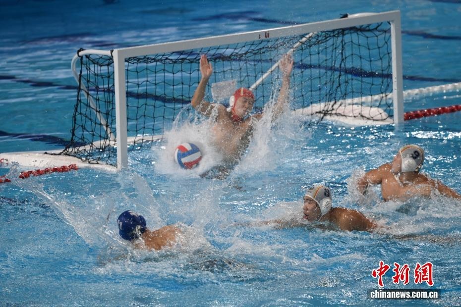 10月27日晚,在廣東廣州舉行的第十五屆全國運(yùn)動(dòng)會(huì)水球男子組比賽金牌賽中,廣東隊(duì)(藍(lán)帽)以16比9戰(zhàn)勝上海隊(duì)(白帽),獲得金牌。圖為上海隊(duì)運(yùn)動(dòng)員王貝易(中)和廣東隊(duì)運(yùn)動(dòng)員譚恒業(yè)(右)在比賽中拼搶。