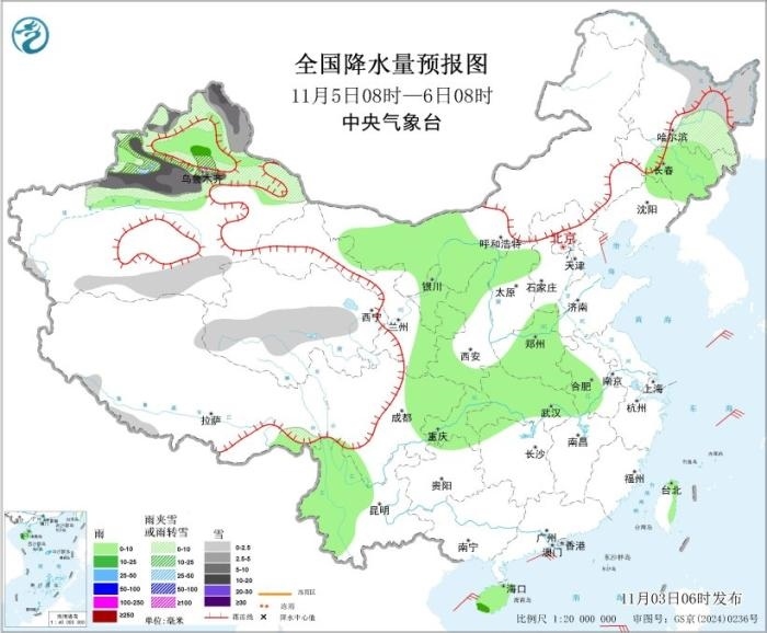 11月5日8時至6日8時,新疆北部、東北地區(qū)東部、青海中部等地部分地區(qū)有小到中雪或雨夾雪,其中,新疆阿勒泰、沿天山一帶等地部分地區(qū)有大到暴雪(10~15毫米),新增積雪深度6~10厘米,部分地區(qū)15~20厘米。內(nèi)蒙古西部、西北地區(qū)東部、黃淮西部、江淮西部、江漢、西南地區(qū)東北部和西南部、海南島等地部分地區(qū)有小雨,局地有中雨。南海東南部海域?qū)⒂?0~12級、陣風(fēng)13級的風(fēng),南海西南部海域?qū)⒂?0~11級、陣風(fēng)12級的風(fēng),南海中部海域?qū)⒂?~8級、陣風(fēng)9級的風(fēng)。