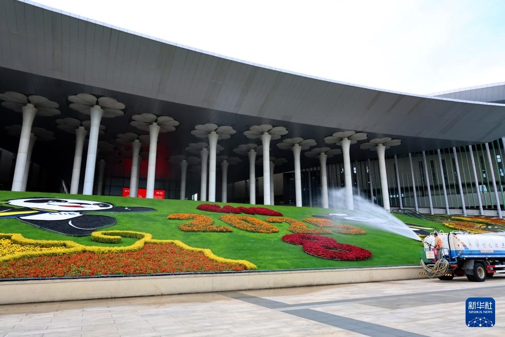 11月3日,工作人員在為國(guó)家會(huì)展中心(上海)南廣場(chǎng)裝飾綠化噴水。