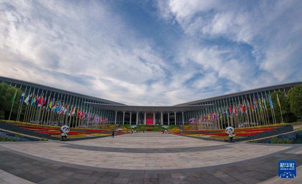 這是裝飾一新的國(guó)家會(huì)展中心(上海)南廣場(chǎng)(11月3日攝)。