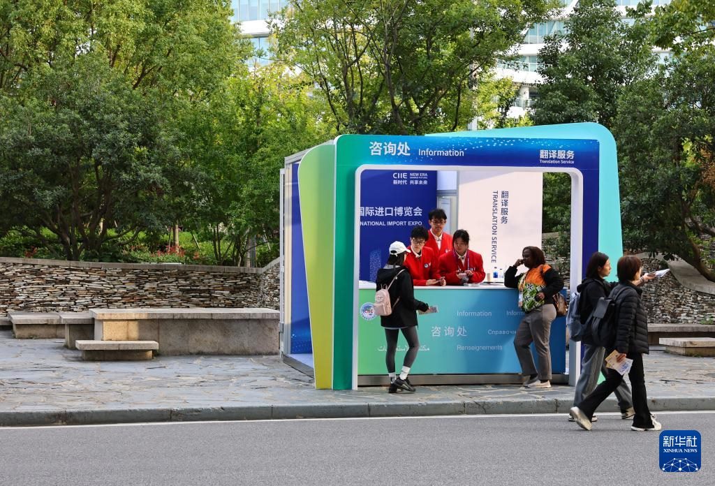 11月3日,志愿者在國(guó)家會(huì)展中心(上海)的一個(gè)咨詢處內(nèi)工作。