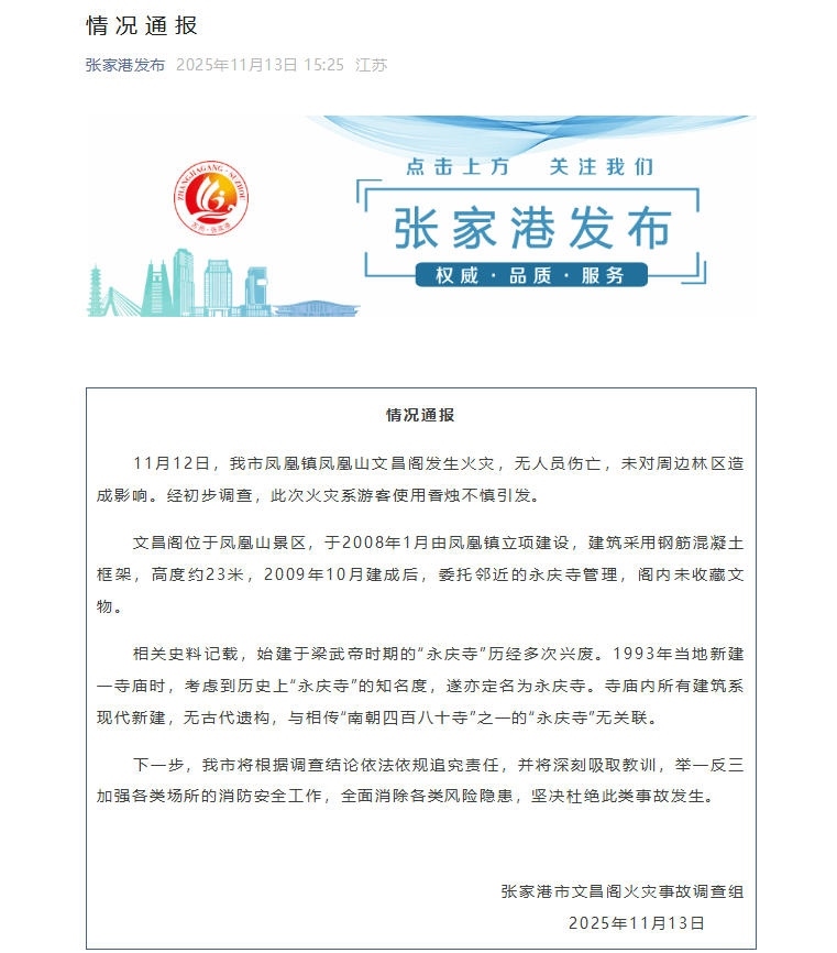中新網(wǎng)11月13日電 據(jù)“張家港發(fā)布”微信公眾號消息,張家港市文昌閣火災事故調(diào)查組13日發(fā)布情況通報。通報指出,11月12日,張家港市鳳凰鎮(zhèn)鳳凰山文昌閣發(fā)生火災,無人員傷亡,未對周邊林區(qū)造成影響。經(jīng)初步調(diào)查,此次火災系游客使用香燭不慎引發(fā)。