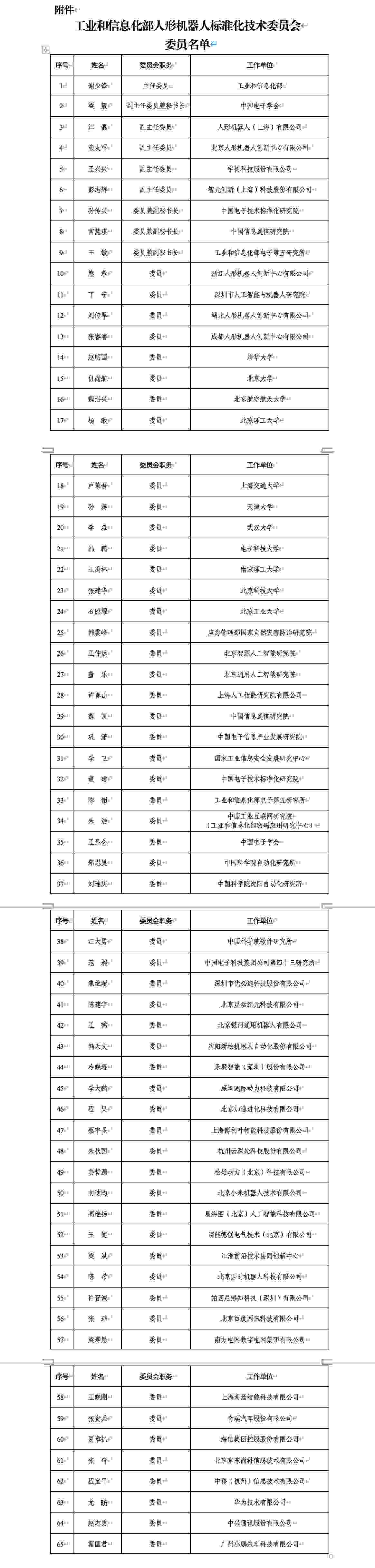 名單共包括65人,其中工業(yè)和信息化部謝少鋒為主任委員,中國電子學(xué)會梁靚為副主任委員兼秘書長,人形機器人(上海)有限公司江磊、北京人形機器人創(chuàng)新中心有限公司熊友軍、宇樹科技股份有限公司王興興、智元創(chuàng)新(上海)科技股份有限公司彭志輝為副主任委員,中國電子技術(shù)標(biāo)準(zhǔn)化研究院孫傳興、中國信息通信研究院宮慧琪、工業(yè)和信息化部電子第五研究所王敏為委員兼副秘書長。