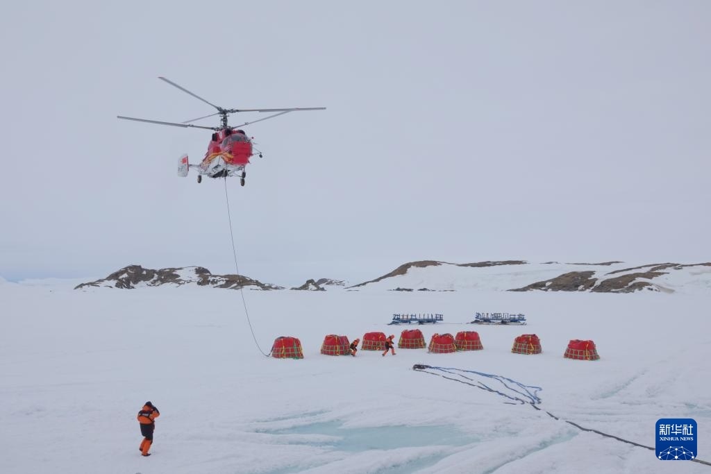 據(jù)悉,“雪龍2”號正采取“白天空吊、夜晚冰運”的節(jié)奏開展物資和燃油卸運,白天利用直升機吊掛油囊,夜間趁低溫海冰承載力較好時開展冰面車輛雪橇運輸。