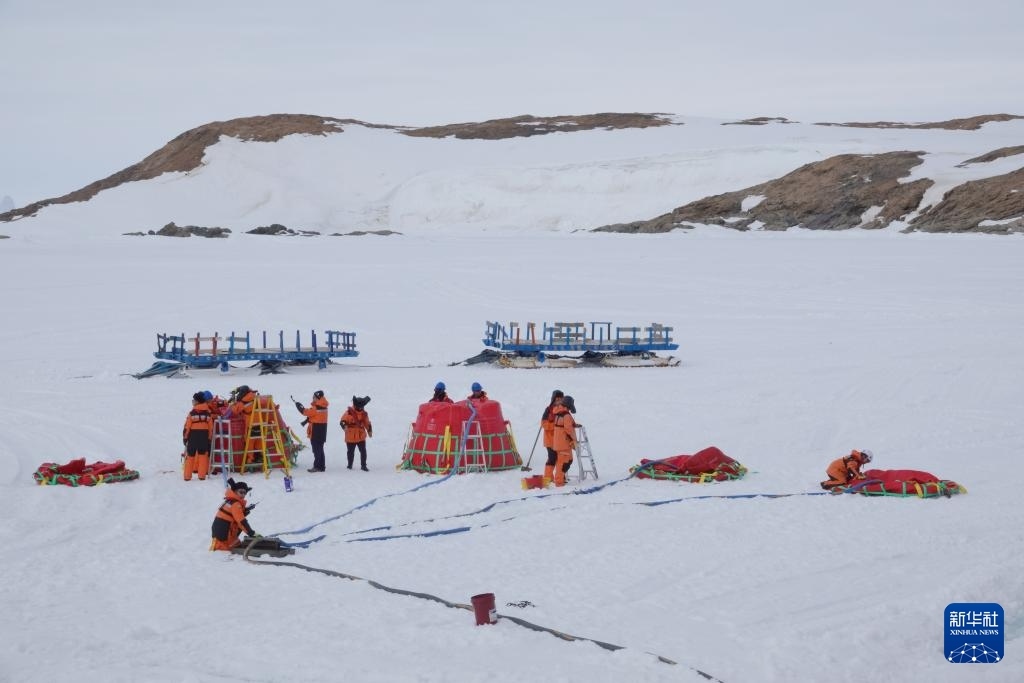 北京時間12月2日傍晚,工作人員在冰面上進行油囊加注作業(yè)。新華社記者 顧天成 攝