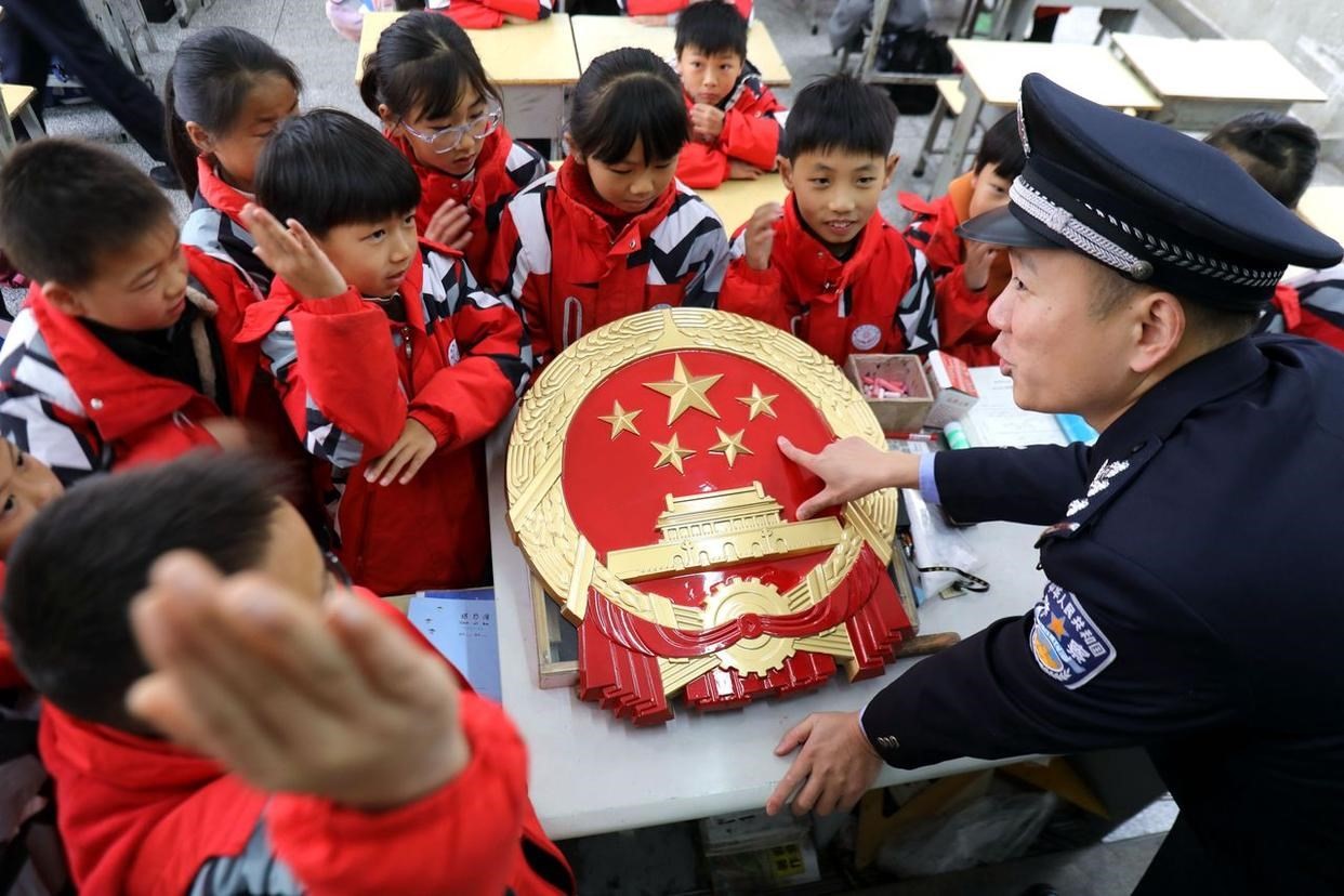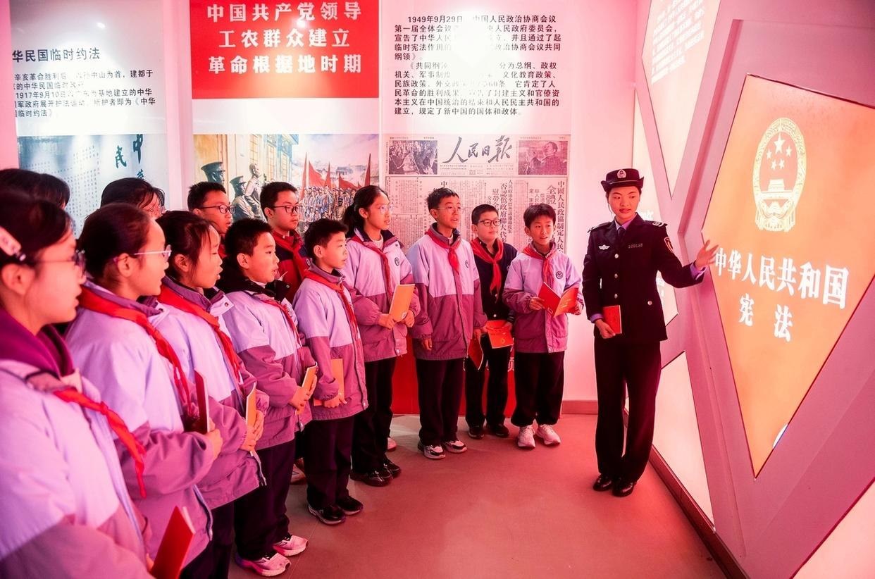 12月3日,安徽省馬鞍山市雨山區(qū)雨山實(shí)驗(yàn)學(xué)校,司法干警給學(xué)生解讀憲法核心內(nèi)容。(工人日?qǐng)?bào)通訊員 歐宗濤 攝)