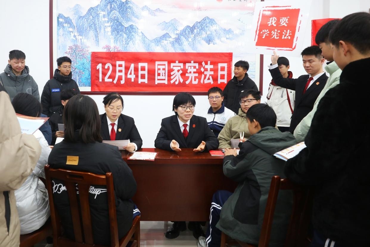 12月3日,山東省棗莊市市中區(qū)人民法院組織法官走進(jìn)校園,開展主題宣傳活動(dòng),向?qū)W生普及憲法知識(shí)、宣傳法治觀念、弘揚(yáng)憲法精神。(工人日?qǐng)?bào)通訊員 孫中喆 攝)