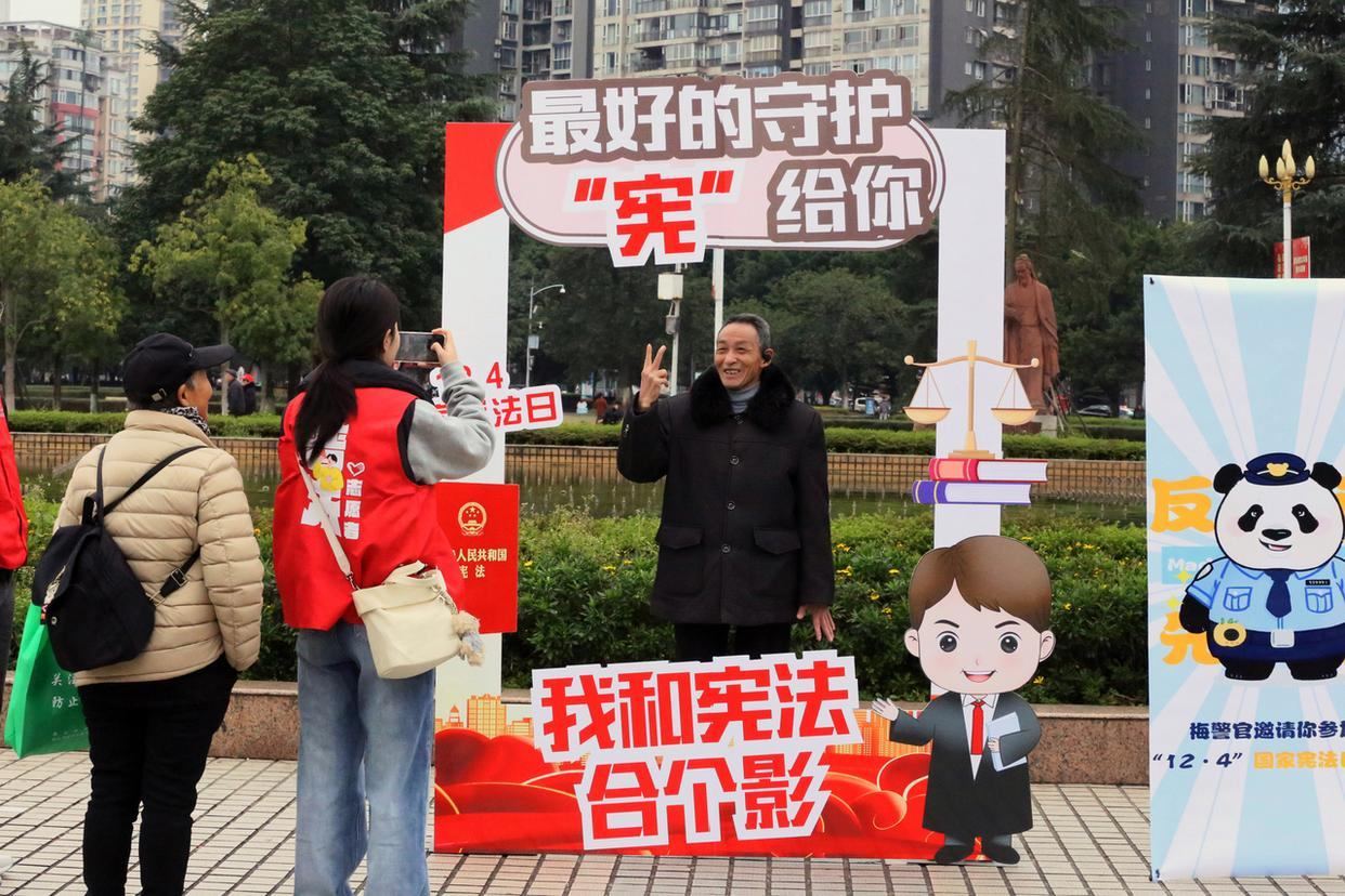 12月4日,四川省樂山市市中區(qū)司法局普法宣傳志愿者在樂山新廣場開展“憲法宣傳日”活動(dòng),市民在法治打卡框合影留念。(工人日?qǐng)?bào)通訊員 李華時(shí) 攝)