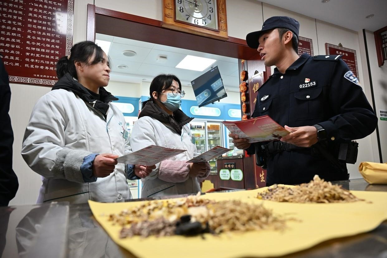 12月2日,安徽省馬鞍山市含山縣公安局林頭派出所聯(lián)合鎮(zhèn)司法所,將“法治課堂”搬進(jìn)菜市場門口,向過往群眾講解《中華人民共和國憲法》《中華人民共和國民法典》等法律法規(guī)。(工人日?qǐng)?bào)通訊員 馮善軍 攝)