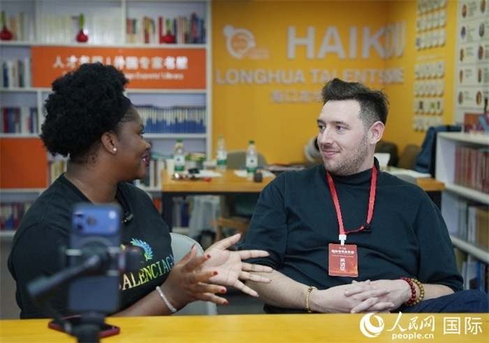 尼日利亞籍創(chuàng)業(yè)者馬爾維斯·烏福馬杜(左一)接受人民網(wǎng)外??旅骺刹稍L。人民網(wǎng)記者 符武平攝