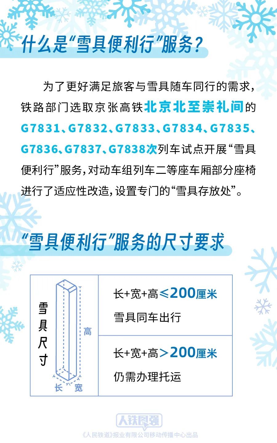 鐵路部門堅(jiān)持以人民為中心的發(fā)展思想,持續(xù)深化運(yùn)輸供給側(cè)結(jié)構(gòu)性改革,積極適應(yīng)旅客多樣化的出行需求,為攜帶雪具出行的旅客提供便捷服務(wù)。前期,鐵路部門按照《國鐵集團(tuán)鐵路旅客運(yùn)輸規(guī)程》“旅客乘坐動車組列車隨身攜帶的行李物品長、寬、高之和不超過130厘米”的規(guī)定,對超過上述尺寸標(biāo)準(zhǔn)的雪具推出了“雪具快運(yùn)”服務(wù)。為了更好滿足旅客與雪具隨車同行的需求,鐵路部門統(tǒng)籌考慮旅客安全、乘車秩序和雪具運(yùn)輸需求,選取京張高鐵北京北至崇禮間的G7831、G7832、G7833、G7834、G7835、G7836、G7837、G7838次列車試點(diǎn)開展“雪具便利行”服務(wù),對動車組列車二等座車廂部分座椅進(jìn)行了適應(yīng)性改造,設(shè)置專門的“雪具存放處”,旅客選擇該服務(wù)后可攜帶長、寬、高之和不超過200厘米的雪具同車出行,滑雪更加方便快捷。對于長、寬、高之和超過200厘米的雪具,由于高鐵列車車內(nèi)空間限制,仍需辦理托運(yùn)。