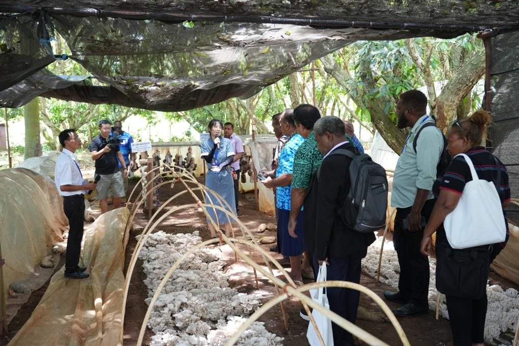 11月19日,在斐濟(jì)楠迪中國—太平洋島國菌草技術(shù)示范中心,與會(huì)代表參觀菌草菇種植示范基地。新華社發(fā)(高鑫攝)