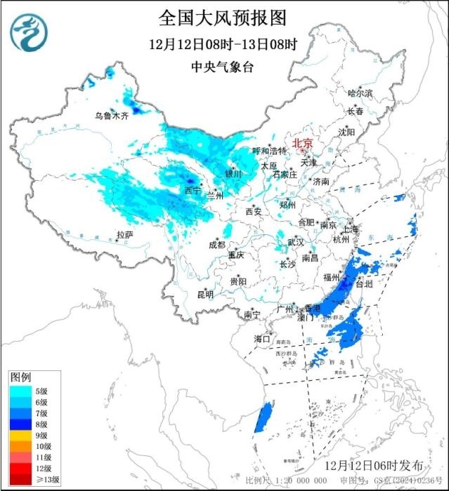 此外,12月12日08時至13日08時,新疆北部、青海、西藏北部、內(nèi)蒙古西部、四川北部、甘肅東部、寧夏、陜西西北部等地部分地區(qū)有5~7級、陣風8~9級的大風,其中,新疆山口地區(qū)陣風可達10~11級;東海南部部分海域、臺灣海峽、巴士海峽、南海東北部和中東部部分海域?qū)⒂?級、陣風8~9級的大風。中央氣象臺12月12日06時繼續(xù)發(fā)布大風藍色預警。