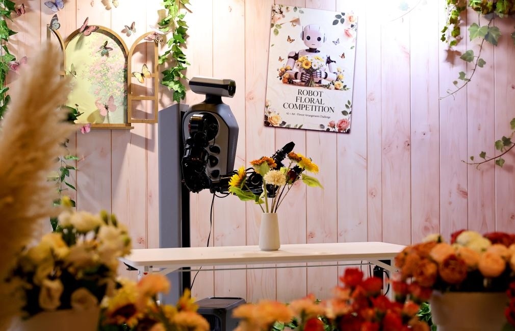 在2025全球開發(fā)者先鋒大會暨國際具身智能技能大賽上,機(jī)器人在插花競技場內(nèi)移動(dòng)。新華社記者方喆攝