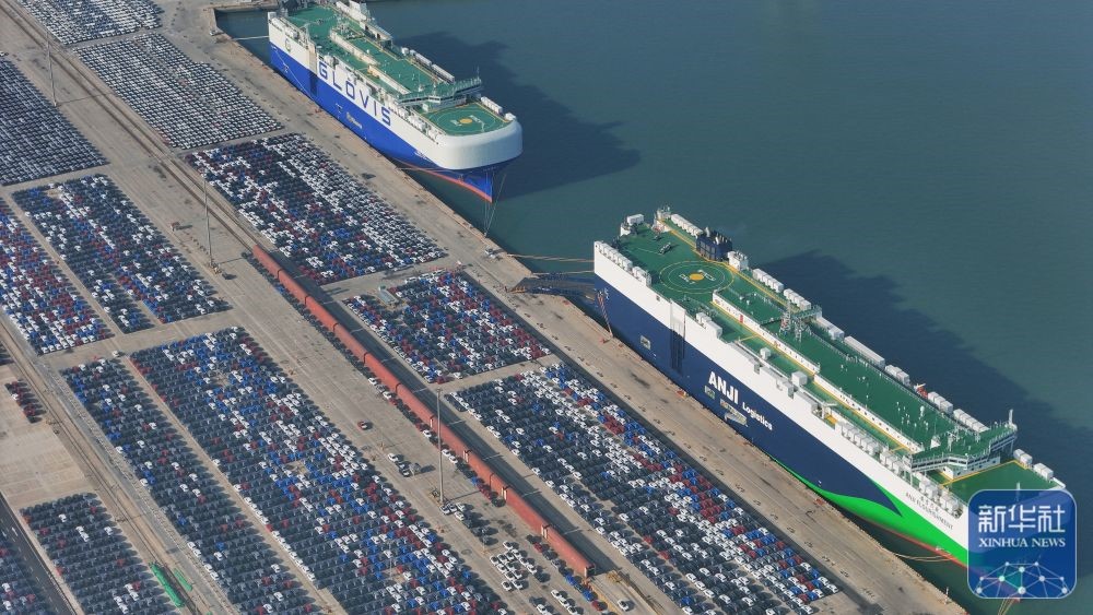 ↑ 12月15日,國產(chǎn)汽車在山東港口煙臺港集結(jié)等待裝船出口(無人機(jī)照片)。新華社發(fā)(唐克攝)