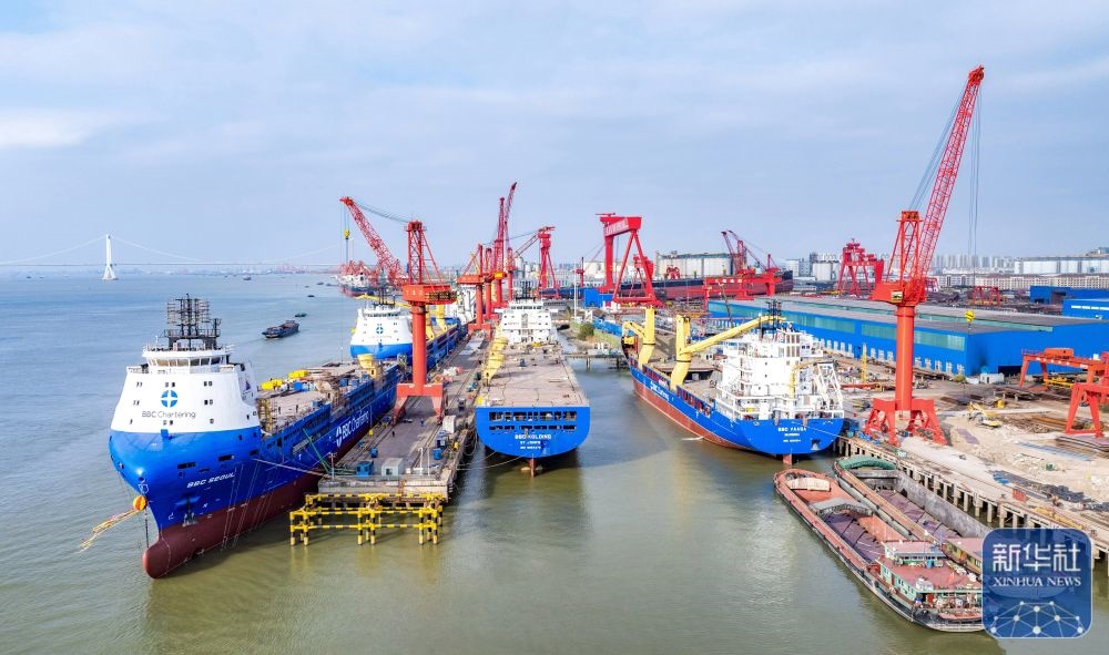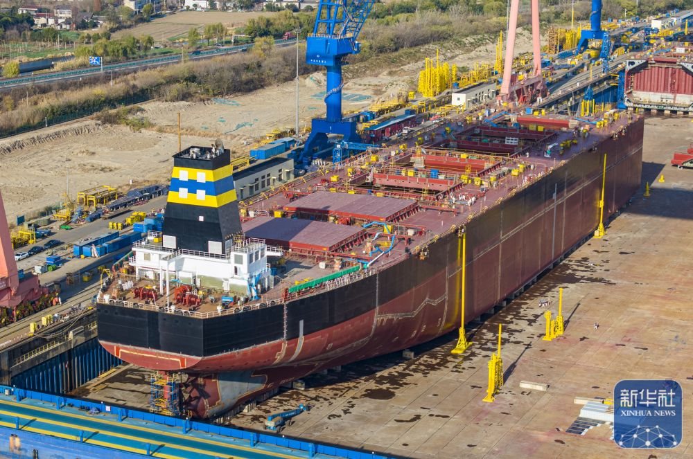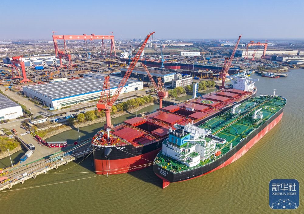 ↑ 這是12月14日拍攝的位于江蘇省江都經(jīng)濟(jì)開發(fā)區(qū)的揚(yáng)州中遠(yuǎn)海運(yùn)重工有限公司生產(chǎn)廠區(qū)(無人機(jī)照片)。新華社發(fā)(任飛攝)