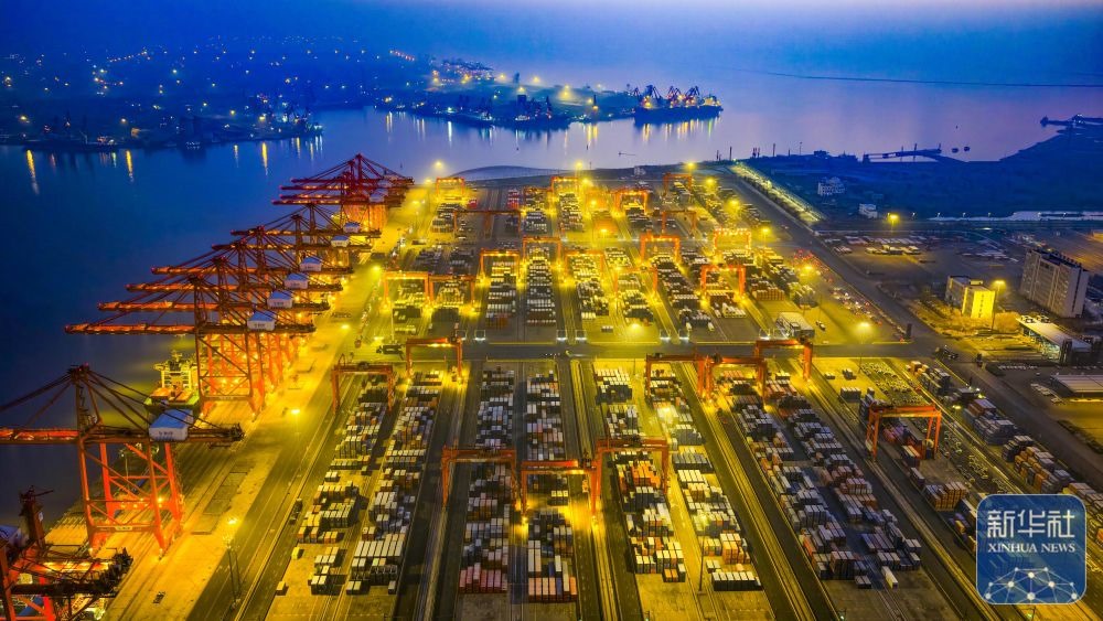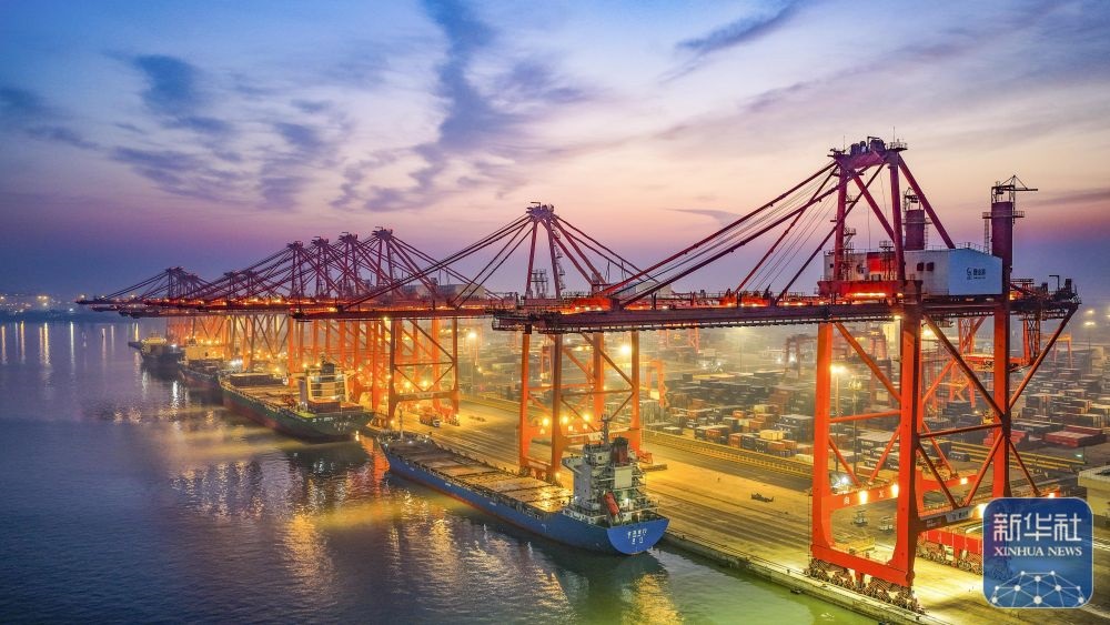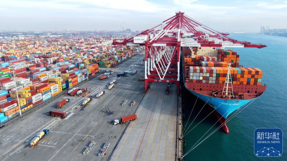 ↑ 12月15日,在山東港口青島港,貨輪在裝卸外貿(mào)集裝箱(無人機(jī)照片)。新華社發(fā)(俞方平攝)