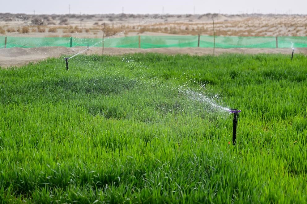 2025年4月13日,新疆阿克蘇地區(qū)沙雅縣沙生經(jīng)濟(jì)作物發(fā)展試驗(yàn)基地,經(jīng)過苦咸水淡化技術(shù)處理的地下水噴灌出的小麥長勢良好。新華社記者丁磊 攝