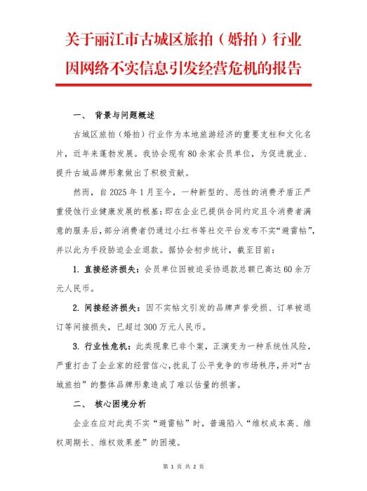 今年10月,麗江市古城區(qū)旅拍行業(yè)協(xié)會發(fā)布的《關(guān)于麗江市古城區(qū)旅拍(婚拍)行業(yè)因網(wǎng)絡(luò)不實(shí)信息引發(fā)經(jīng)營危機(jī)的報(bào)告》。