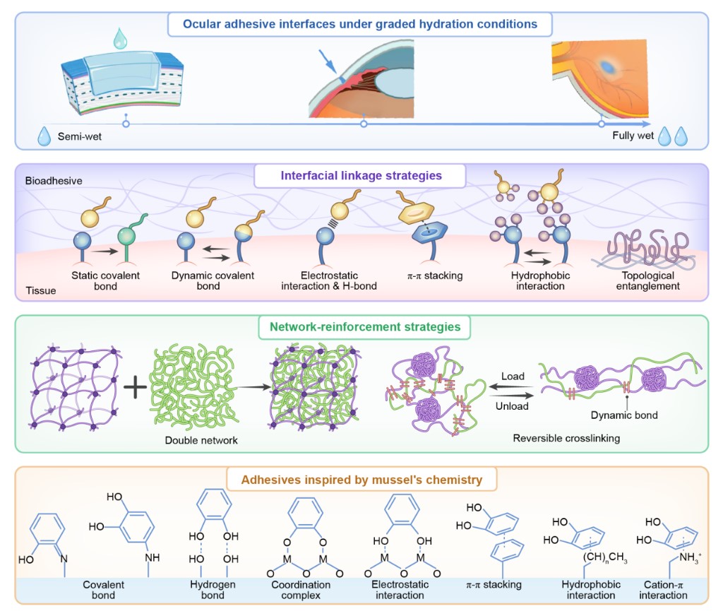 研究團隊介紹,眼科粘合材料分為眼表粘合和眼底粘合兩大類,針對性解決不同眼部區(qū)域的治療需求。對于角膜等眼表疾病,“生物膠水”已展現(xiàn)出亮眼潛力,能實現(xiàn)無縫線角膜移植,填充修復大范圍角膜缺損,即便在濕潤、滲血的復雜創(chuàng)面上也能即時封閉,可大幅拓展眼表修復的適用場景,提升治療效果。
