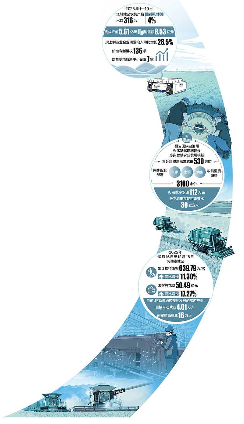 歲末之際,北疆大地處處涌動著蓬勃生機(jī)與創(chuàng)新活力。從智能農(nóng)機(jī)產(chǎn)銷兩旺到數(shù)字農(nóng)田“云端”管理,從冰雪熱潮點(diǎn)燃消費(fèi)新引擎到物流樞紐貫通能源動脈,一幅以“新”為底色的發(fā)展畫卷正徐徐展開。本期北疆觀察版年終盤點(diǎn),聚焦四組生動實(shí)踐,看新技術(shù)、新產(chǎn)業(yè)、新模式如何匯聚成新質(zhì)生產(chǎn)力,為區(qū)域高質(zhì)量發(fā)展注入強(qiáng)勁動能。