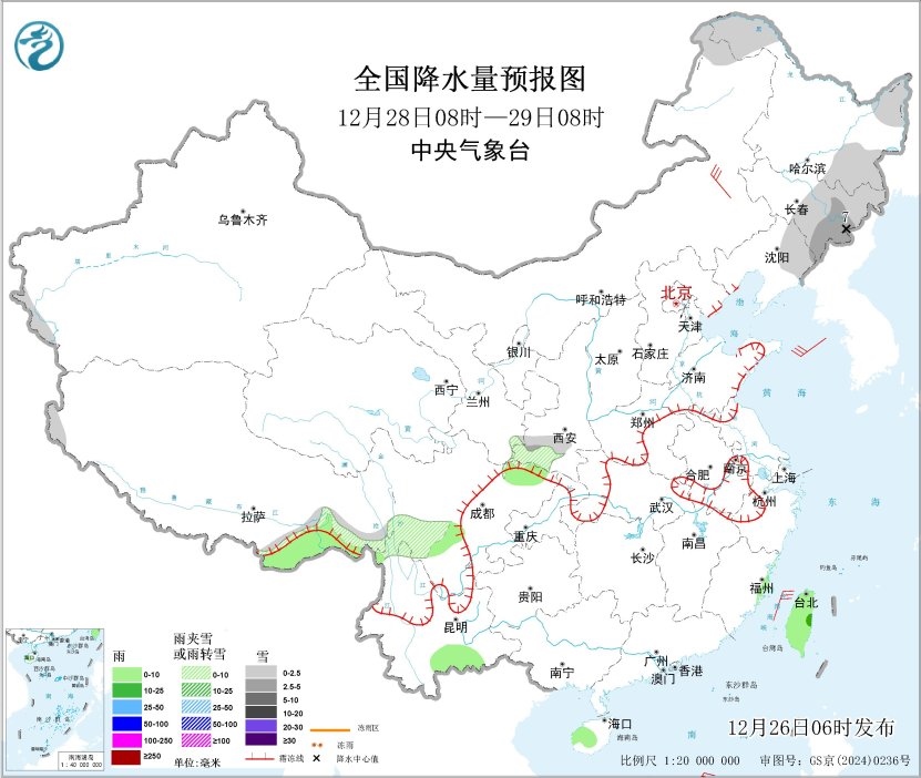 12月28日08時至29日08時,內(nèi)蒙古東北部、東北地區(qū)北部和東部、西藏東南部、陜西南部、四川中部等地部分地區(qū)有小雪或雨夾雪,其中,吉林東部等地部分地區(qū)有中到大雪(5~7毫米)。西藏東南部、四川中部、云南南部、海南島中部、臺灣島等地部分地區(qū)有小雨,其中,臺灣島東部等地部分地區(qū)有中雨。內(nèi)蒙古東部部分地區(qū)有4~6級風;南部海域有5~6級風,陣風7~8級。