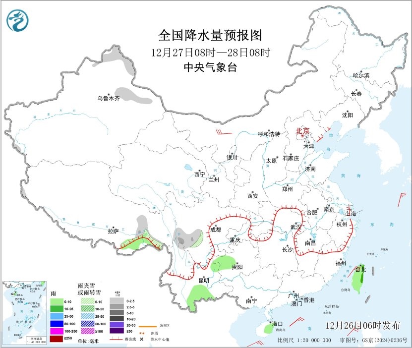 全國降水量預報圖(12月26日08時-27日08時)