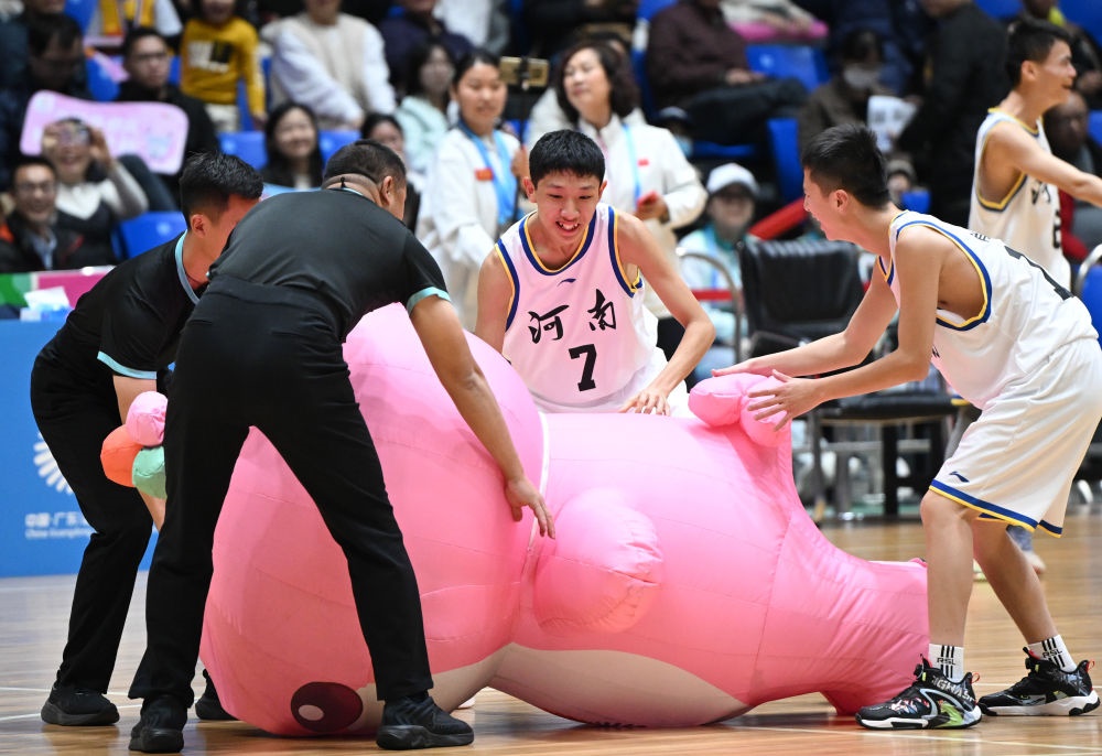12月14日,河南隊球員在比賽間隙和吉祥物“樂融融”互動。新華社記者 鄧華 攝