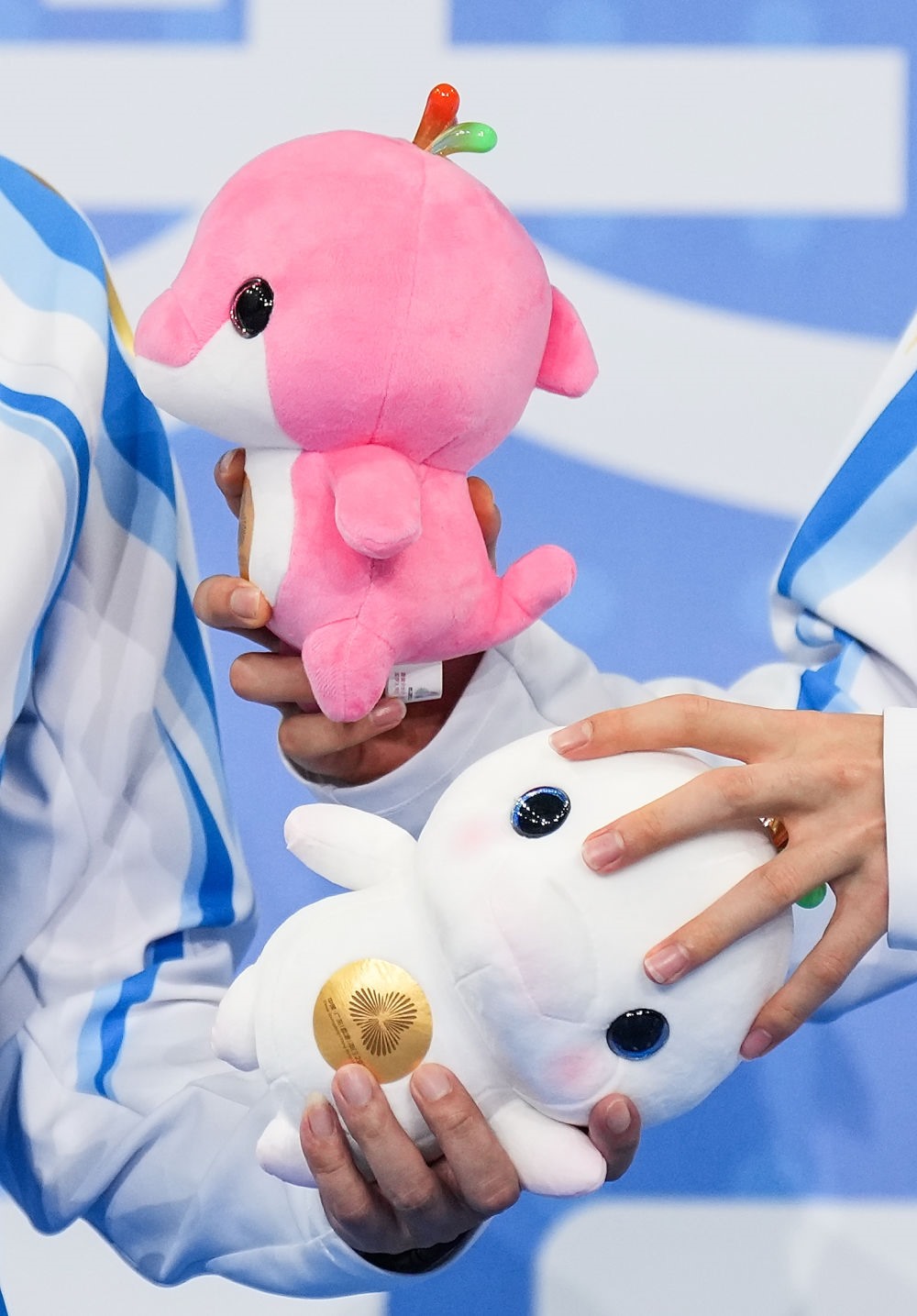 11月14日,第十五屆全國運動會游泳男子100米自由泳決賽在廣東省深圳市舉行,圖為冠軍浙江隊選手潘展樂和教練在頒獎儀式上交換吉祥物。新華社記者 薛宇舸 攝