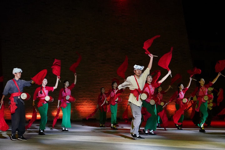 2025年7月29日,演員在位于陜西延安的金延安文化旅游產(chǎn)業(yè)園區(qū)表演紅色歌舞劇《延安十三年》。新華社記者 樊雨晴 攝