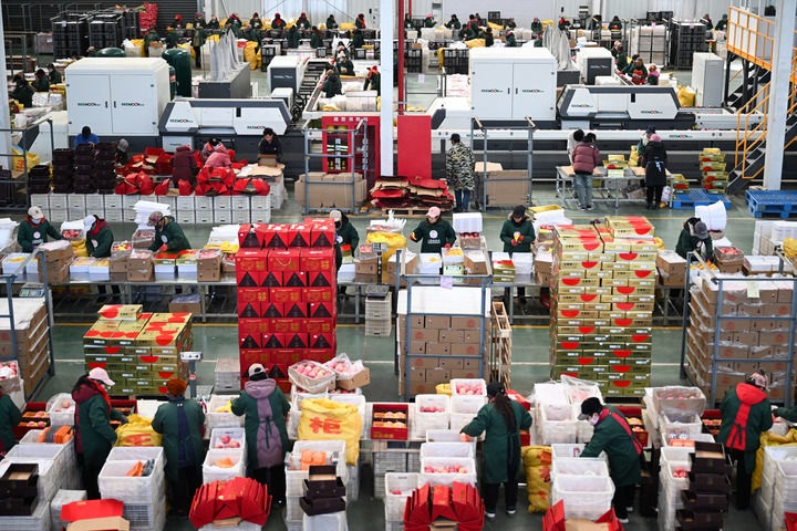 2025年1月6日,在陜西延安市洛川縣一家果業(yè)企業(yè),工作人員在生產(chǎn)線工作。新華社記者 張博文 攝