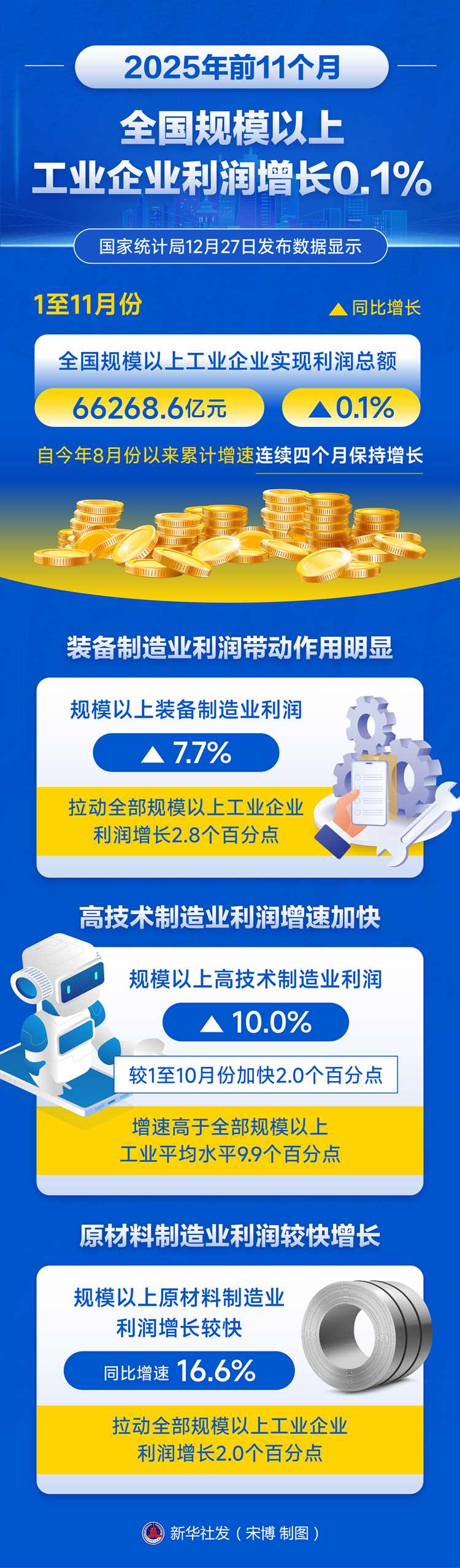 新華社北京12月27日電(記者王雨蕭)國(guó)家統(tǒng)計(jì)局27日發(fā)布數(shù)據(jù)顯示,1至11月份,全國(guó)規(guī)模以上工業(yè)企業(yè)實(shí)現(xiàn)利潤(rùn)總額66268.6億元,同比增長(zhǎng)0.1%,自今年8月份以來(lái)累計(jì)增速連續(xù)四個(gè)月保持增長(zhǎng)。