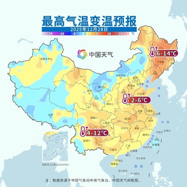 這場年尾超級大回暖正在席卷我國大部地區(qū),并將持續(xù)至29日。明后天,回暖幅度和范圍進(jìn)一步升級,北方地區(qū)明天氣溫普遍達(dá)到高點,南方地區(qū)將在后天(29日)前后迎來過程氣溫高點。其中明天,最高氣溫0℃線將同期少見地挺進(jìn)東北,并北抬至吉林中部,黃淮南部到江南普遍在15℃以上,華南也將重返20℃以上,短袖有了重新出場的機(jī)會。